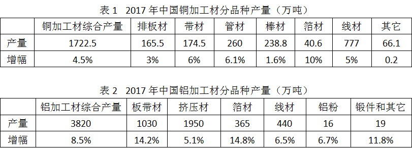 2017年,包括排板材、带材、管材、棒材、箔材、线材等在内的“铜加工材综合产量”为1722.5万吨,比2016年增长4.5%。